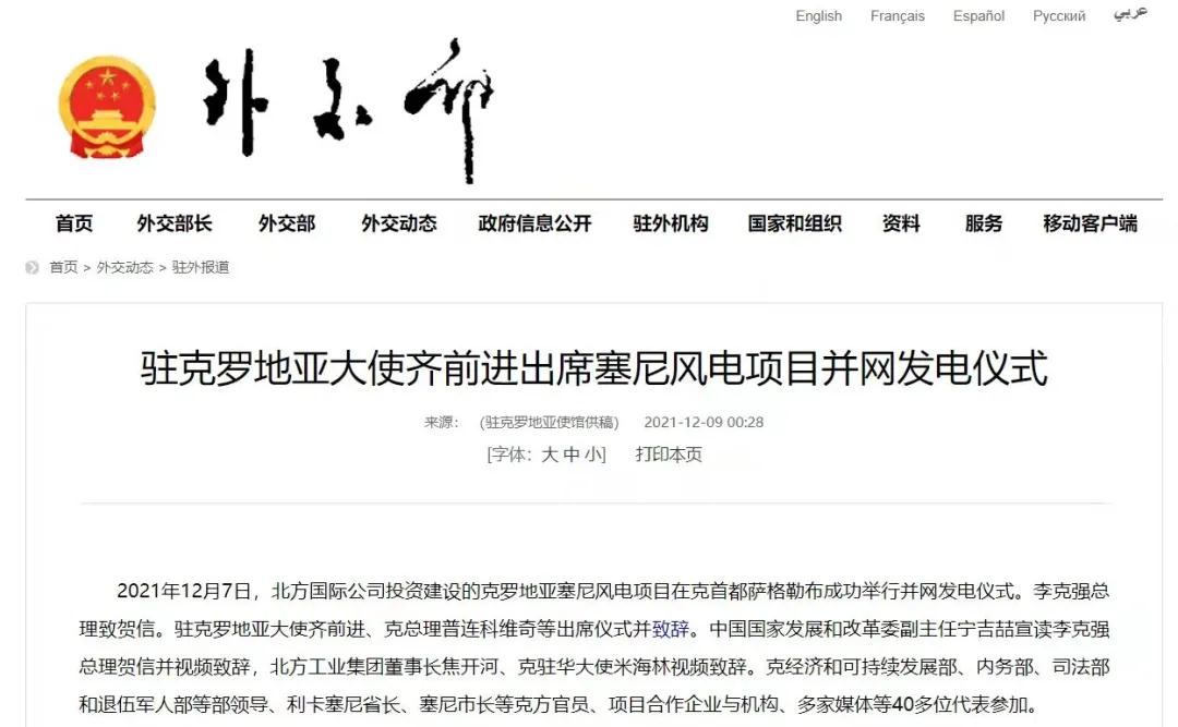2021年12月7日,中國兵器工業(yè)集團(tuán)有限公司北方公司所屬北方國際投資、建設(shè)和運營的塞尼156MW風(fēng)電項目在克羅地亞首都薩格勒布隆重舉行并網(wǎng)發(fā)電儀式。李克強總理致賀信。克羅地亞總理安德烈·普連科維奇,中國駐克羅地亞大使齊前進(jìn)出席儀式并致辭。中國國家發(fā)展和改革委員會副主任寧吉喆宣讀李克強總理賀信并視頻致辭,中國兵器工業(yè)集團(tuán)有限公司董事長焦開河、克駐華大使米海林視頻致辭。