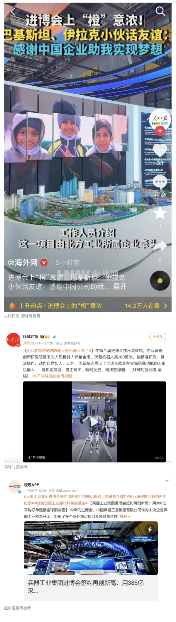 在微博、抖音等新媒體平臺上,集團公司高科技產品演示、5D穹幕電影體驗等短視頻持續引爆流量,累計播放量超800萬次,點贊量破50萬?!氨鞴I集團進博會簽約386億”相關話題登上微博熱搜榜,閱讀量破5000萬次。
